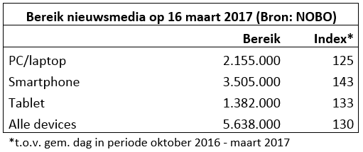 Aangejaagd door smartphone-gebruik bereikte NU.nl op 16 maart netto 3 miljoen Nederlanders. Ook de digitale platforms van AD en De Telegraaf behaalden die dag meer dan een miljoen bezoekers.